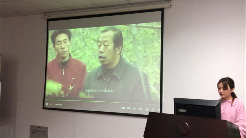紧接着,羿明璇播放了李保国同志先进事迹的短视频。通过简短的视频,我们可以了解到,李保国同志,紧密结合群众,心系群众,努力奋斗,带领广大农民群众艰苦创业,打造一条特殊的产业之路,带领广大人民群众共同走上富裕生活的道路,是一名优秀的共产党员,是新时代的楷模。