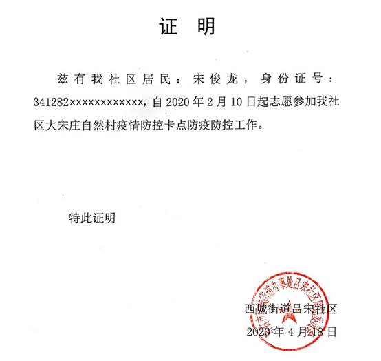 经过这次参与抗“疫”行动,“志愿”一词对于我来说有了更加特殊的含义。我在本科期间就有着丰富的志愿服务工作经历,那些经历让我体会到志愿精神的内涵,而这次抗“疫”行动则让我进一步感受到志愿服务工作本身的魅力。虽然当时的我还不是一名党员,但作为入党积极分子,也应该以党员的标准来严格要求自己,通过行动积极向党组织靠拢。