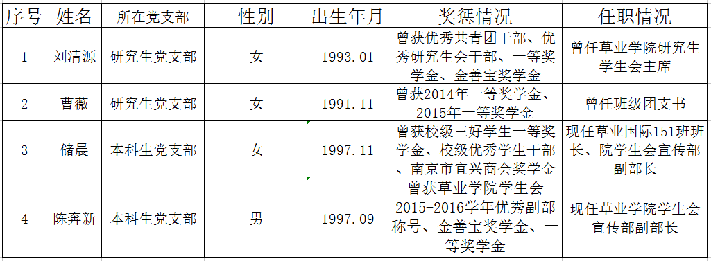 根据禁漫天堂 党员发展工作安排,经由各团支部推选,党建班考核,党支部讨论,结合个人成绩等综合表现,经院党总支讨论审核,2016年12月拟发展中共预备党员共4名,具体名单如下: